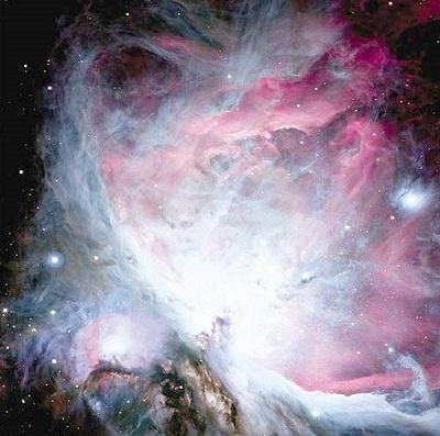 オリオンの心臓の中のトラページアムの明るい星々、中央を横切る暗い塵の大きな曲線の通路、広がる赤い熱烈な水素ガスと生まれたての星々の光を反射する青い色をおびる塵は、複雑な星雲状物質で埋められています。